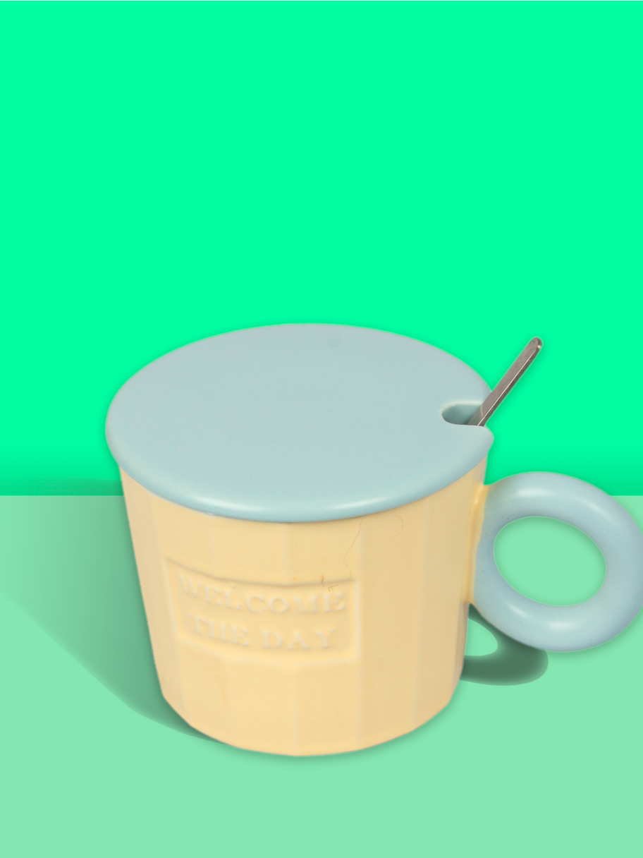 Taza de cerámica en tonos pastel con tapa, ideal para disfrutar tus bebidas favoritas con un toque de dulzura y mantenerlas calientes.