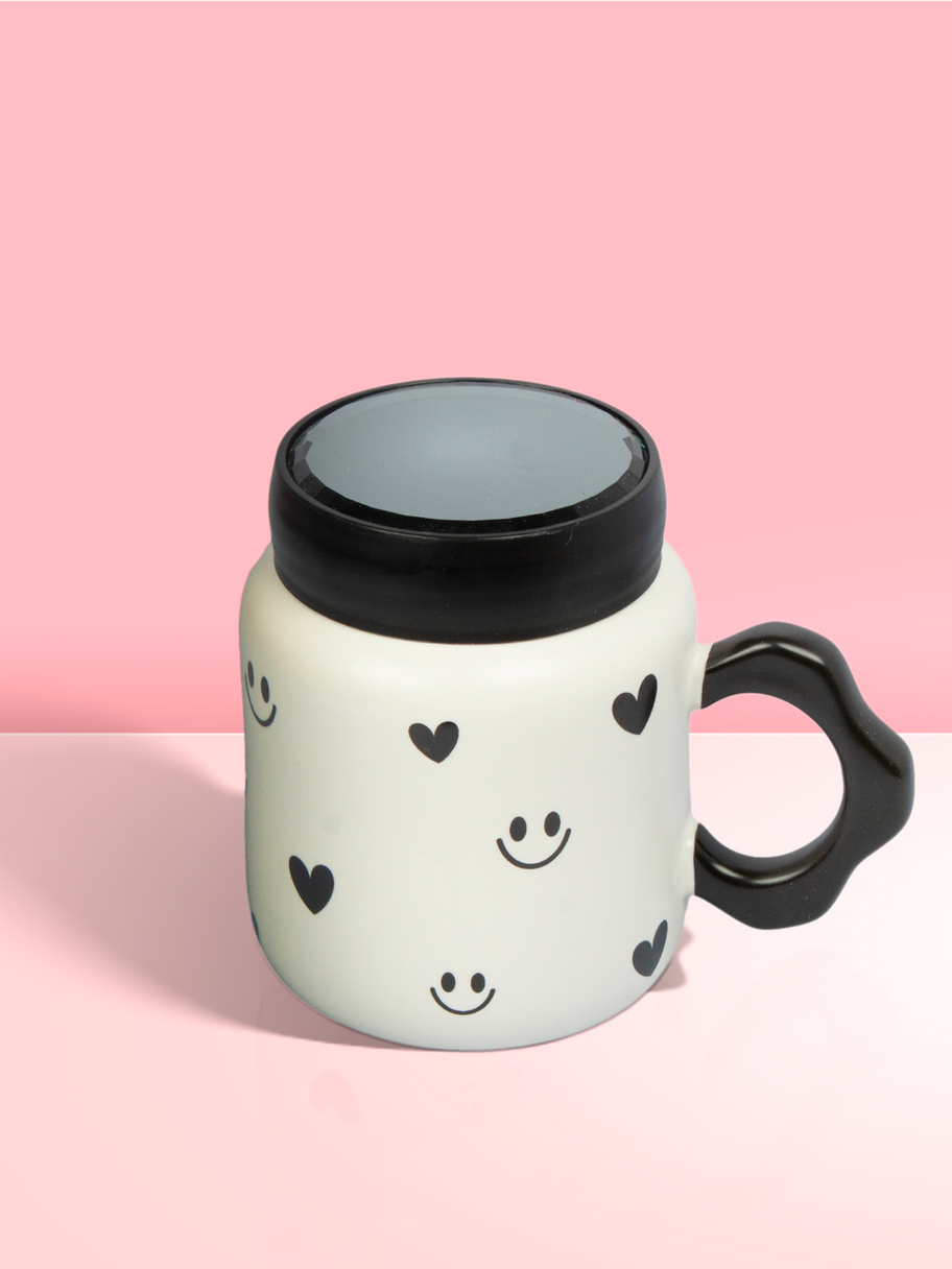 Innovadora taza de cerámica con tapa efecto espejo y diseño geométrico, perfecta para tus bebidas con un toque moderno y único.