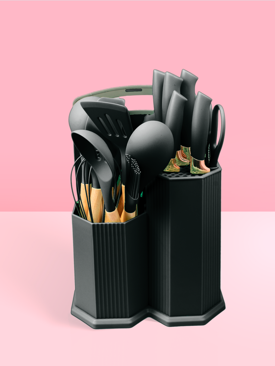 Este es un set integral de 19 piezas que equipa tu cocina con una variedad de utensilios esenciales, además de incluir una cuchilla versátil y una tabla de cortar. Es la solución perfecta para quienes buscan una colección completa de herramientas para cocinar, preparar alimentos y servir, todo en un solo paquete conveniente.