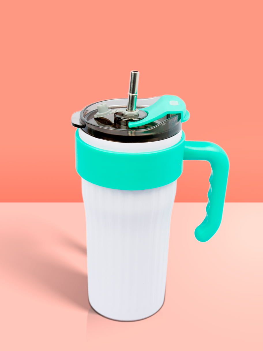 Este es un vaso de viaje robusto y funcional, con una capacidad de 850 ml, diseñado para ofrecer una hidratación cómoda y mantener tus bebidas a la temperatura ideal durante horas. Su característica principal es la manija integrada, que facilita su transporte y agarre, haciéndolo perfecto para el día a día, la oficina, el gimnasio o cualquier actividad al aire libre.